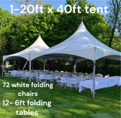 This rental package offers a spacious 20ft x 40ft tent complete with tables and chairs, perfect for hosting outdoor events. It provides a sheltered, versatile space where guests can dine, chat, and enjoy the occasion without worrying about weather disruptions.